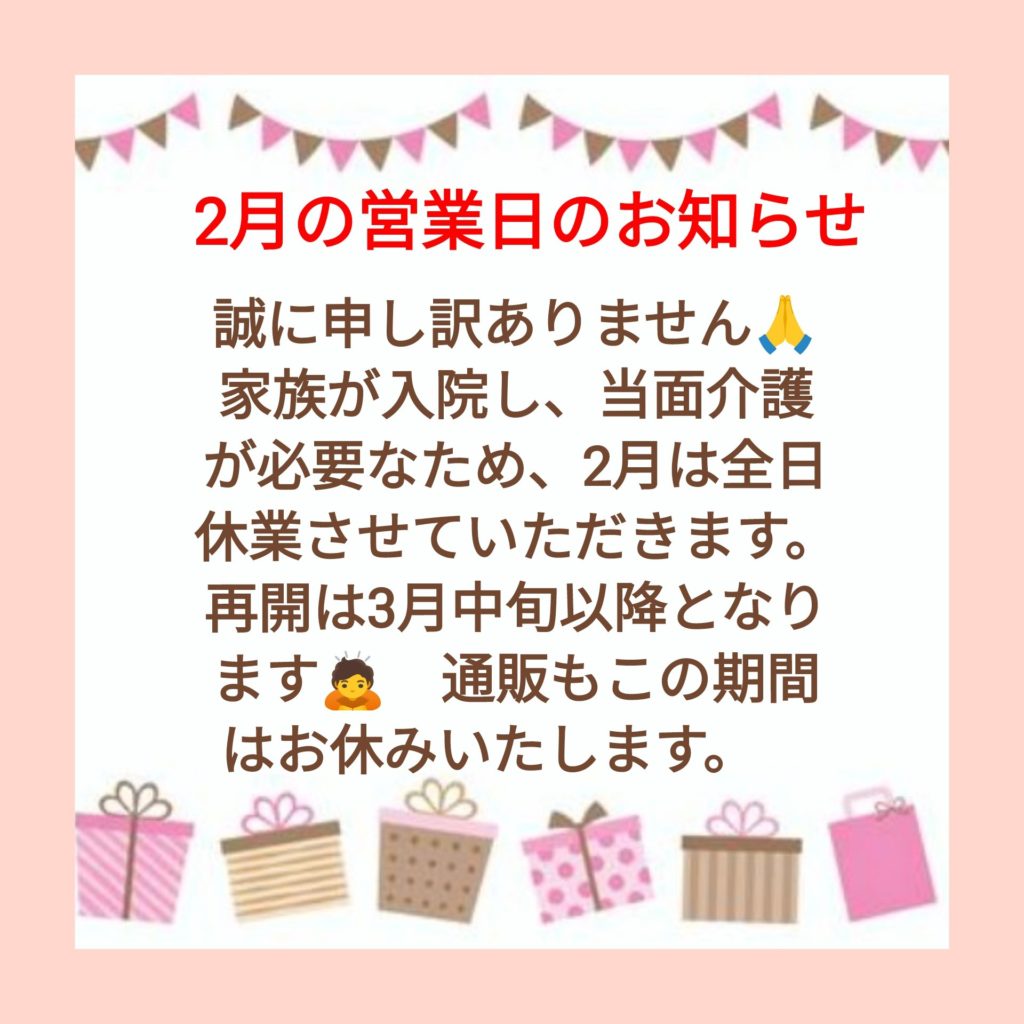 今後の営業についてのお知らせ今後の営業についてのお知らせです。家族の入院で退院後も介護が必要になるため、2月の営業は休業いたします。再開は3月中旬あたりになるかと思われます。通販作業もこの期間はお休みいたします。お客様にはご迷惑をおかけして